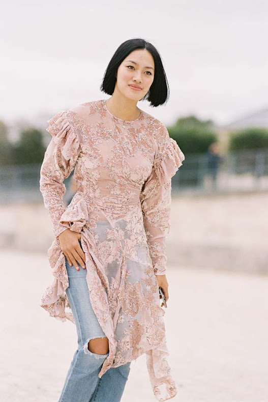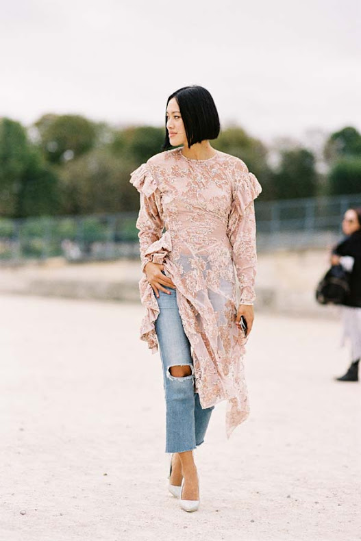 Beautiful blush pink devore velvet paired so perfectly with distressed denim.