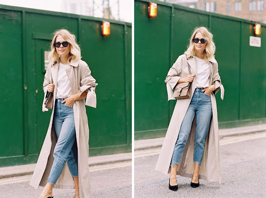 Hey there Jessie with the seriously good done/undone hair. Yes to the trench + fancy mules + denim + pristine white tee.