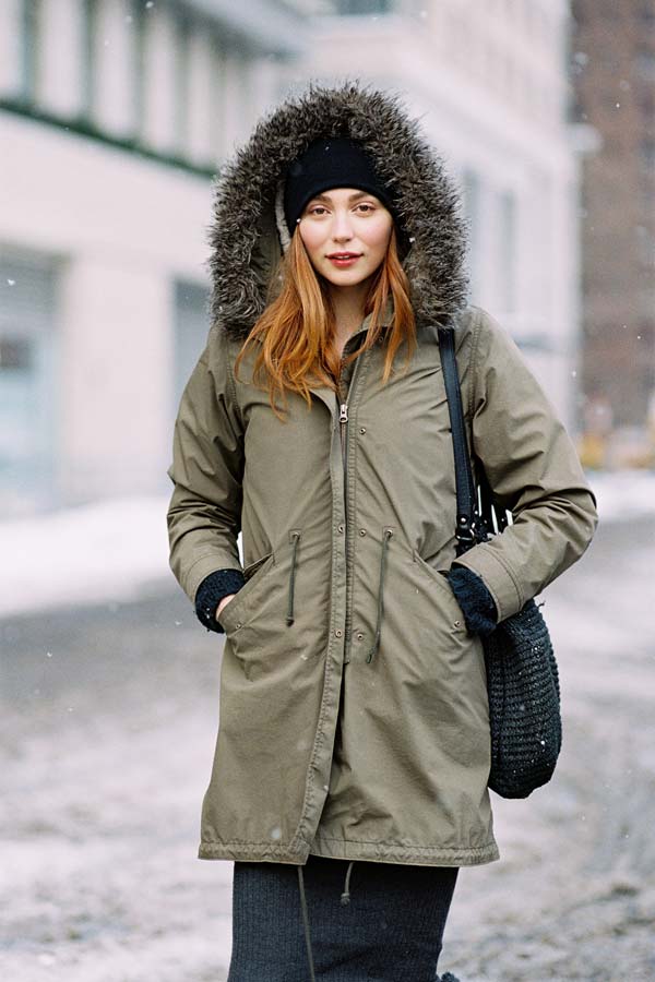 In the Snow: Anorak with (faux) fur trim.Recreate her look (kind of):