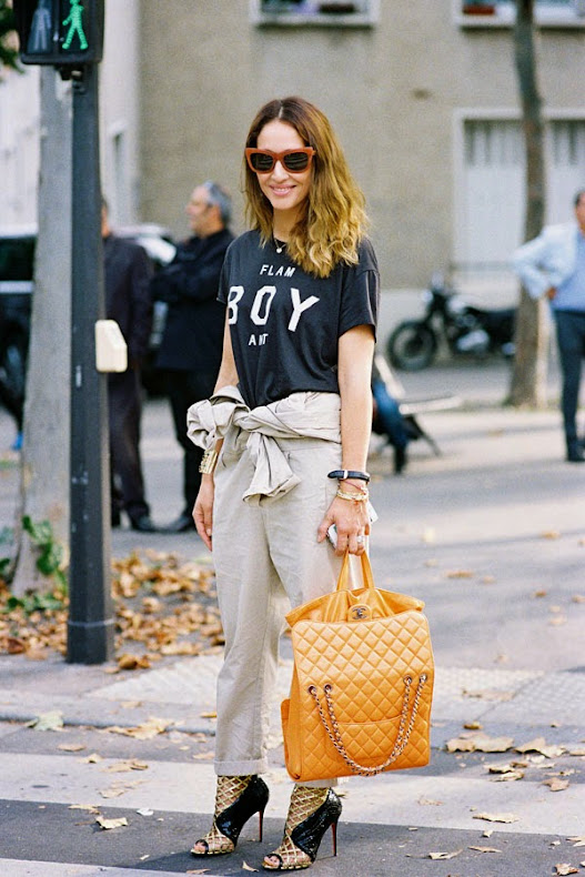 An alternate way to wear tie-waist pants: with a cute printed tee and a quilted Chanel tote.